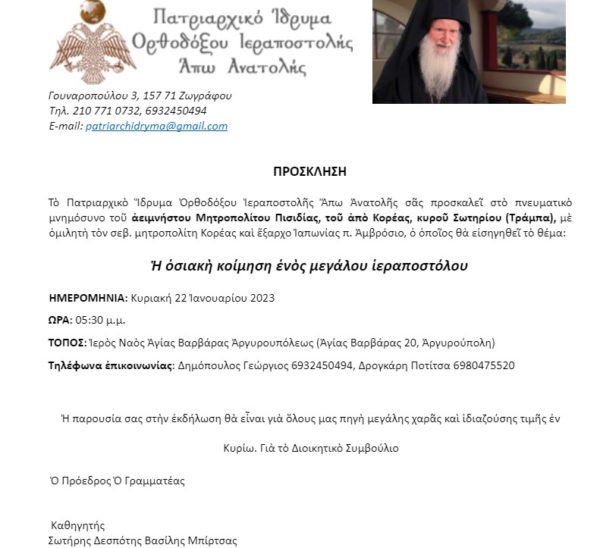 Το Πατριαρχικό Ίδρυμα Ορθοδόξου Ιεραποστολής Άπω Ανατολής απευθύνει πρόσκληση στο πνευματικό μνημόσυνο του αειμνήστου Μητροπολίτη Πισιδίας, του από Κορέας, κυρού Σωτηρίου (Τράμπα), με ομιλητή τον Σεβασμιώτατο Μητροπολίτη Κορέας και Έξαρχο Ιαπωνίας κ. Αμβρόσιο, ο οποίος θα εισηγηθεί το θέμα:
