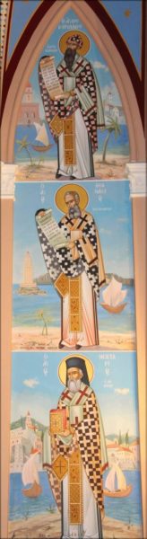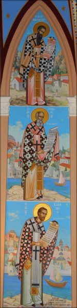 Η πρωτοτυπία των παραστάσεων αυτών έγκειται στο γεγονός ότι στο φόντο κάθε Ιεράρχη υπάρχει ένα χαρακτηριστικό που συνδέεται με τον τόπο που διακόνησε. Στις τοιχογραφίες του Ιερού Χρυσοστόμου και του Αγίου Γρηγορίου του Θεολόγου διακρίνεται η Αγία Σοφία, στου Μεγάλου Βασιλείου τα βουνά της Καισάρειας της Καππαδοκίας, στου Μεγάλου Αθανασίου και του Αγίου Κυρίλλου ο φάρος της Αλεξάνδρειας, ενώ στου Αγίου Νεκταρίου το Μοναστήρι της Αγίας Τριάδος στην Αίγινα.