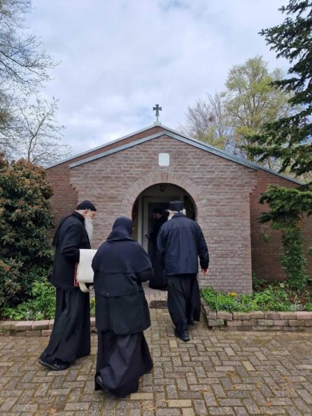 Πρώτος σταθμός της επισκέψεως η Ιερά Μονή του Γενεθλίου της Θεοτόκου στο Άστεν της Ολλανδίας, όπου ο Καθηγούμενος και η συνοδεία του έγιναν δεκτοί από την Γερόντισσα Ιωάννα, προσκύνησαν στο Καθολικό, τέλεσαν επιμνημόσυνη δέηση στον τάφο της μακαριστής κτιτόρισσας Ηγουμένης Μαρίας, ξεναγήθηκαν στους χώρους και παρακάθησαν σε γεύμα, ενώ είχαν την ευκαιρία να επισκεφθούν το Αγιογραφείο και το κηροπλαστείο της Μονής.