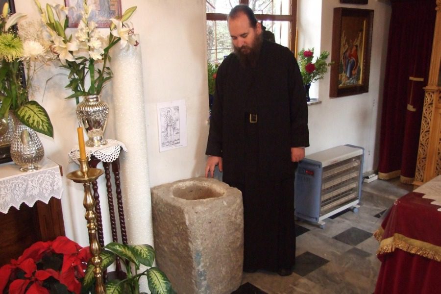 Πριν λίγα χρόνια η πέτρα αυτή εντοπίστηκε. Μέσα σε ένα μαγαζί εκεί δίπλα στην παλιά βρύση που γκρεμίστηκε για τη δημιουργία της σύγχρονης εικόνας της πολιτείας, και την οποία ο παππούς του σημερινού ιδιοκτήτη κουβάλησε για να χρησιμοποιείται για πάγκος. Ήταν η πέτρα πάνω στην οποία λεγόταν στην τούρκικη παράδοση πως «σφάζονταν οι Γκιαούρηδες». Για ετούτο το λόγο πάντα μέσα στο μαγαζί κάποια στιγμή η πέτρα σκάφτηκε στο πάνω της σημείο για να χρησιμοποιηθεί σαν γλάστρα αλλά και πάλι άλλαξε απόφαση ο ιδιοκτήτης της και την κράτησε μέσα στο μαγαζί. Σαν να έπρεπε να μείνει εκεί, δίπλα από το σημείο του μαρτυρίου του Αγίου περιμένοντας ένας Θεός ήξερε τι…