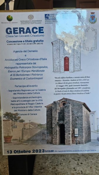 Στην Κρατική Υπηρεσία Περιουσίας στο Reggio Calabria υπεγράφη την Παρασκευή 13 Οκτωβρίου 2023, η συμβολαιογραφική πράξης με την οποία το Ιταλικό κράτος, μέσω του οποίου το Υπουργείο Πολιτισμού, η Περιφερειακή Γραμματεία της Calabria και η Επιθεώρηση Πολιτιστικής Κληρονομιάς, εμπιστεύονται τον ναό του San Giovanello στο Gerace στην Ιερά Μητρόπολη Ιταλίας για 19 χρόνια.