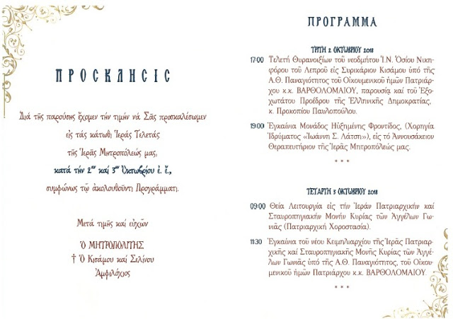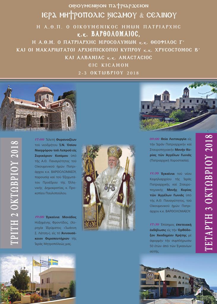 Στη συνέχεια στο χωρίο Σηρικάριον Κισάμου θα πραγματοποιηθούν τα θυρανοίξια του Ιερού Ναού του Οσίου Νικηφόρου Λεπρού υπό της Α.Θ.Π. του Οικουμενικού Πατριάρχου κ.κ. ΒΑΡΘΟΛΟΜΑΙΟΥ Α΄, παρουσία της Α.Ε. του Προέδρου της Δημοκρατίας, κ. Προκοπίου Παυλοπούλου και άλλων Επισήμων. Να σημειώσουμε ότι ο Ναός είναι ο πρώτος στην Ελλάδα στον οποίο επιχειρείται η ενεργειακή αυτονόμηση και η αξιοποίηση των σύγχρονων τεχνολογιών για την αναβάθμιση του ενεργειακού αποτυπώματός του. Η παραπάνω έμπρακτη δράση της τοπικής Εκκλησίας εντάσσεται πλήρως στην ανάληψη περιβαλλοντικών πρωτοβουλιών από το Οικουμενικό Πατριαρχείο για την ευαισθητοποίηση όλων στην προστασία του Φυσικού Περιβάλλοντος.