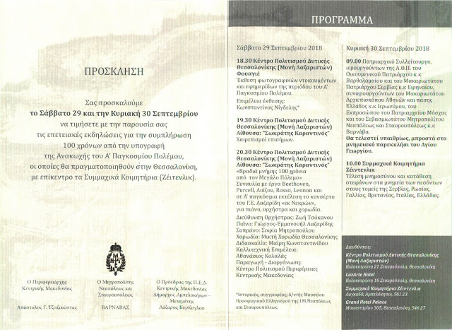 Κορυφαίο γεγονός των εκδηλώσεων θα αποτελέσει το Πατριαρχικό Συλλείτουργο, από τον Οικουμενικό Πατριάρχη, τον Πατριάρχη Σερβίας και αρχιερείς, το οποίο θα τελεσθεί την Κυριακή 30 Σεπτεμβρίου 2018 (ώρα 9 π.μ.) υπαιθρίως, έμπροσθεν του μνημειακού παρεκκλησίου του Αγίου Γεωργίου στον σερβικό τομέα των Συμμαχικών Κοιμητηρίων του Ζέιτενλικ (οδός Λαγκαδά), όπου και θα πραγματοποιηθεί, μετά την επιμνημόσυνη δέηση, κατάθεση στεφάνων από τον Οικουμενικό Πατριάρχη στα μνημεία των πεσόντων σε όλους τους τομείς (Σερβικό, Γαλλικό, Βρετανικό, Ρωσικό, Ιταλικό και Ελληνικό).