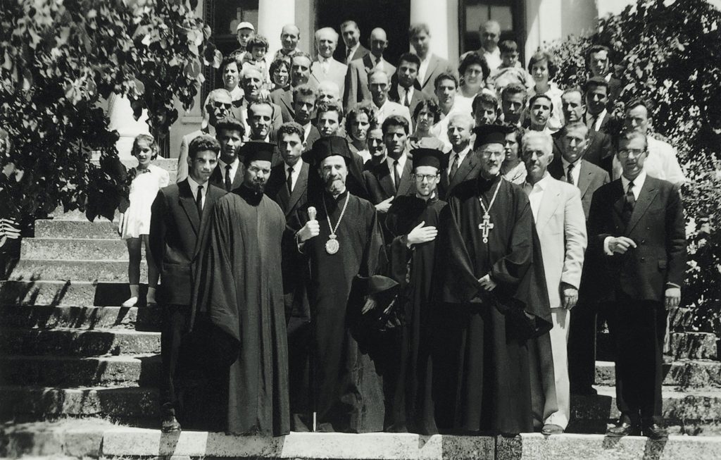 Φωτογραφία, από το προσωπικό Αρχείο του Παναγιωτάτου, από την εις Διάκονο χειροτονία του από τον Μητροπολίτη Ιμβρου Μελίτωνα. Με κληρικούς και κατοίκους της Ίμβρου μπροστά στη Μητρόπολη.