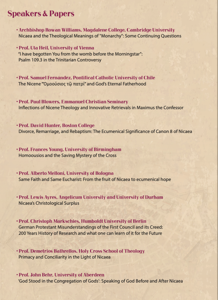 Στο Ακαδημαϊκό αυτό Συμπόσιο του Οικουμενικού Πατριαρχείου προσκλήθηκαν ως ομιλητές οι επιφανέστεροι παγκοσμίως μελετητές και συγγραφείς έργων, σχετικών με την Α´ Οικουμενική Σύνοδο καθ᾽ εαυτήν αλλά και την γενικότερη επίδρασή της στον Χριστιανικό κόσμο.