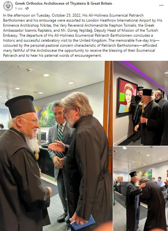 «Η αναχώρηση του Παναγιωτάτου Οικουμενικού Πατριάρχη κ.κ. Βαρθολομαίου ολοκληρώνει μια ιστορική και επιτυχημένη εορταστική επίσκεψη στο Ηνωμένο Βασίλειο. To αξιομνημόνευτο πενθήμερο ταξίδι -χαρακτηριζόμενο από την προσωπική ποιμαντική μέριμνα του Πατριάρχη κ.κ. Βαρθολομαίου- έδωσε την ευκαιρία σε πολλούς πιστούς της Αρχιεπισκοπής να λάβουν την ευλογία του Οικουμενικού Πατριάρχη και να ακούσουν τα πατρικά ενθαρρυντικά λόγια του», αναφέρει χαρακτηριστικά και μεταξύ άλλων η Αρχιεπισκοπή Θυατείρων και Μεγάλης Βρετανίας σε σχετικό μήνυμα της σε μέσο κοινωνικής δικτύωσης.