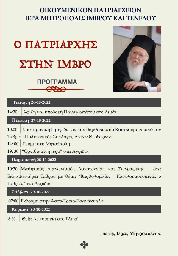 Μετά την επιστροφή του στην Κωνσταντινούπολη ο Οικουμενικός Πατριάρχης θα αναχωρήσει την Τετάρτη 26 Οκτωβρίου για τη γενέτειρά του Ίμβρο όπου θα συμμετάσχει στην εκδηλώσεις για το έτος “Βαρθολομαίου Κουτλουμουσιανού του Ιμβρίου”.