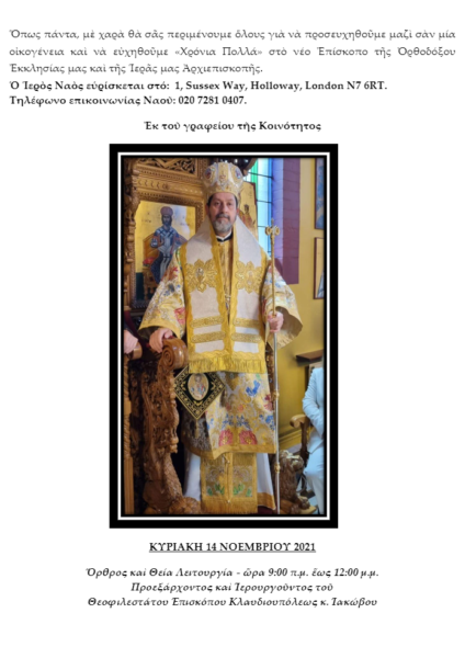 Κατά τον όρθρο και την Θεία Λειτουργία κατόπιν ευλογίας του Σεβασμιωτάτου Αρχιεπισκόπου Θυατείρων και Μεγάλης Βρετανίας κ. Νικήτα, θα προστεί ο Θεοφιλέστατος Επίσκοπος Κλαυδιουπόλεως κ. Ιάκωβος.
