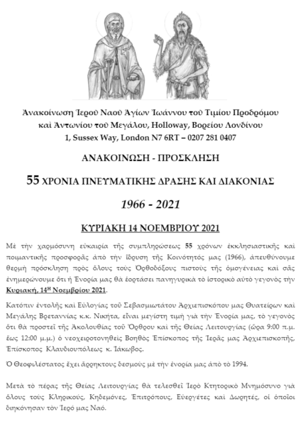 Με την ευκαιρία της συμπληρώσεως των 55 χρόνων εκκλησιαστικής και ποιμαντικής προσφοράς από την ίδρυση της Ορθόδοξης κοινότητας στο Holloway του Βόρειου Λονδίνου, ο Ιερός Ναός Αγίων Ιωάννου του Τιμίου Προδρόμου και Αντωνίου του Μεγάλου θα εορτάσει πανηγυρικά το ιστορικό αυτό γεγονός την Κυριακή 14 Νοεμβρίου 2021.