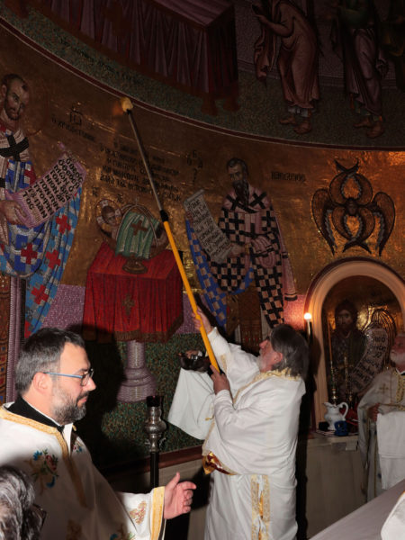 Στον πανηγυρικό Εσπερινό χοροστάτησε ο Σεβασμιώτατος Αρχιεπίσκοπος Θυατείρων και Μεγάλης Βρεταννίας κ. Νικήτας, συγχοροστατούντων των Σεβεσμιωτάτων Μητροπολιτών Κολωνίας κ. Αθανασίου και Κιτίου κ. Νεκταρίου και των Θεοφιλεστάτων Επισκόπων Μελιτηνής κ. Μαξίμου και Κλαυδιουπόλεως κ. Ιακώβου.