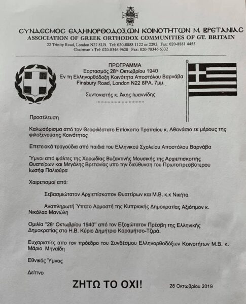 Εορτασμοί για την 28η Οκτωβρίου 1940 στον καθεδρικό ναό της Θεοτόκου στο Wood Green, Ν. Λονδίνο, από όπου αλιεύουμε τα παρακάτω φωτογραφικά στιγμιότυπα: