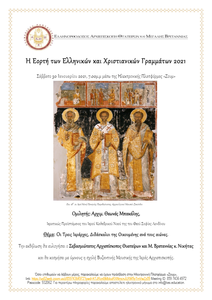 Η Εορτή των Ελληνικών και Χριστιανικών Γραμμάτων 2021, αναμένεται να τελεστεί διαδικτυακά φέτος στη Μεγάλη Βρετανία το Σάββατο 30 Ιανουαρίου, στις 7.00 μ.μ.