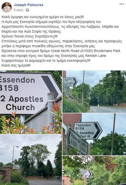 “Επιτέλους, μετά από πολλούς αγώνες, παρακλήσεις, αιτήσεις και προσφυγές μπήκε η περίφημη πινακίδα, οδηγώντας στην Εκκλησία μας” αναφέρει ο Πρωτοπρεσβύτερος π. Ιωσήφ Παλιούρας της Ιεράς Αρχιεπισκοπής Θυατείρων και Μεγάλης Βρετανίας, σε επίκαιρη ανάρτησή του. “Βρίσκεται στον κεντρικό δρόμο Great North Road (A1000) Brookmans Park και στην στροφή προς τον δρόμο της Εκκλησίας μας Kentish Lane. Ευχαριστούμε το Δημαρχείο και το τμήμα κυκλοφορίας!”.