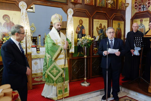 Στο τέλος της Θείας Λειτουργίας, ο Θεοφιλέστατος ανέγνωσε το συγχαρητήριο γράμμα του Σεβ. Αρχιεπισκόπου Θυατείρων και Μεγάλης Βρεταννίας κ. Νικήτα, προς τον νέο Επίτιμο Πρόεδρο της Κοινότητος κ. Ανδρέα Μακρή.