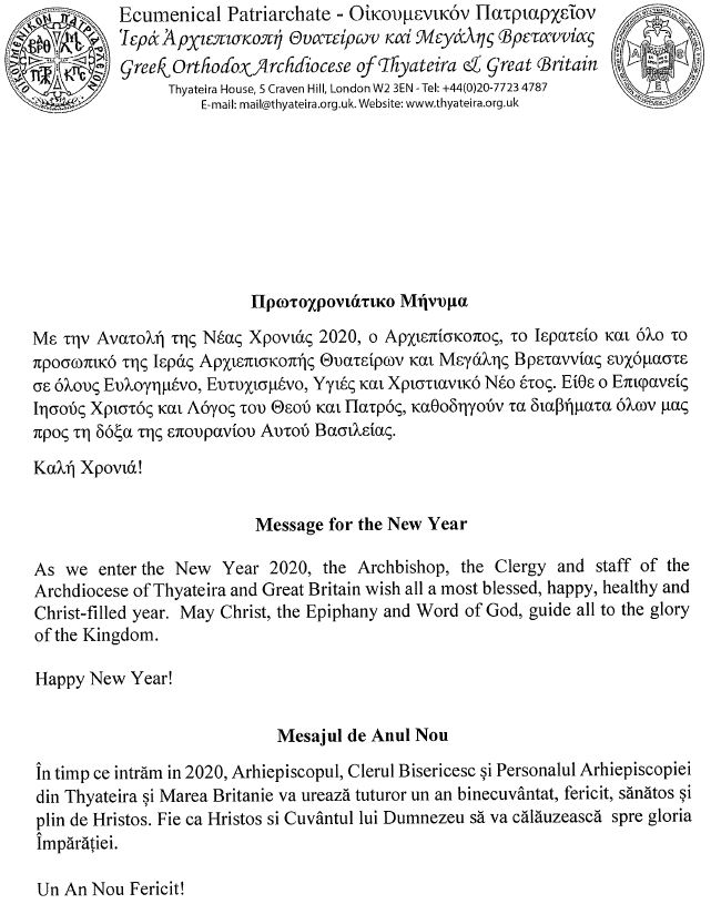 Με την Ανατολή της Νέας Χρονιάς 2020, ο Αρχιεπίσκοπος, το Ιερατείο και όλο το προσωπικό της Ιεράς Αρχιεπισκοπής Θυατείρων και Μεγάλης Βρεταννίας ευχόμαστε σε όλους Ευλογημένο, Ευτυχισμένο, Υγιές και Χριστιανικό Νέο έτος. Είθε ο Επιφανείς Ιησούς Χριστός και Λόγος του Θεού και Πατρός, καθοδηγούν τα διαβήματα όλων μας προς τη δόξα της επουρανίου Αυτού Βασιλείας.