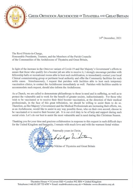 Εγκύκλιο εξέδωσε ο Αρχιεπίσκοπος Θυατείρων και Μεγάλης Βρετανίας κ. Νικήτας σχετικά με την μετάλλαξη Όμικρον και τις προσπάθειες της κυβέρνησης να εξασφαλίσει πρόσβαση στην ενισχυτική δόση του εμβολίου σε όσους πληρούν τις προϋποθέσεις. Σύμφωνα με τον ίδιο, οι Ενορίες καλούνται να παραχωρήσουν εγκαταστάσεις τους ώστε να γίνουν εμβολιαστικά κέντρα, καθώς αυτό επιτάσσει ο φιλανθρωπικός χαρακτήρας της Εκκλησίας και αποτελεί αστικό καθήκον.
