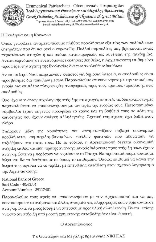 Ο Αρχιεπίσκοπος Θυατείρων και Μεγάλης Βρετανίας κ. Νικήτας εξέδωσε ειδική εγκύκλιο με τίτλο “Εκκλησία και Κοινωνία” με την οποία ενημερώνει για τους τρόπους βοήθειας αλλά και τις πρωτοβουλίες που έχουν ήδη ληφθεί.