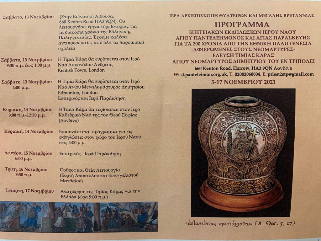 Κατόπιν προσκλήσεως του Αρχιεπισκόπου Θυατείρων και Μεγάλης Βρετανίας κ. Νικήτα και με σχετική παράκληση του Προέδρου, των Εκκλησιαστικών Συμβούλων και του ιερατικού Προισταμένου της Κοινότητος Αγίου Παντελεήμονος του Ιαματικού και Αγίας Μεγαλομάρτυρος Παρασκευής Harrow του βορειοδυτικού Λονδίνου, μεταφέρθηκε τη Παρασκευή 5 Νοεμβρίου, η τιμία Κάρα του Αγίου Νεομάρτυρος Δημητρίου στη πρωτεύουσα της Αγγλίας, στο πλαίσιο των εορταστικών εκδηλώσεων για τα 200 χρόνια από την Εθνική Παλιγενεσία,αφιερωμένων στους αγίους Νεομάρτυρες.
