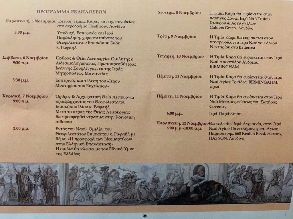 Κατά τη διάρκεια της παραμονής της αγίας Κάρας στο Λονδίνο, θα παρεβρεθεί και σε άλλους πανηγυρίζοντες Ιερούς Ναούς της Αρχιεπισκοπής Θυατείρων, σύμφωνα με το πρόγραμμα, το οποίο έχει ήδη καταρτισθεί.