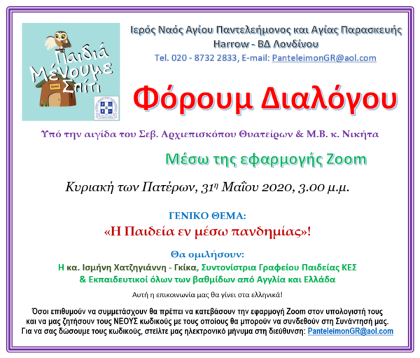 Έναν διαδικτυακό Διάλογο με θέμα “Η Παιδεία εν μέσω πανδημίας” διοργανώνει ο Ιερός Ναός του Αγίου Παντελεήμονος και της Αγίας Παρασκευής του Βορειοδυτικού Λονδίνου υπό την αιγίδα του Σεβασμιωτάτου Αρχιεπισκόπου Θυατείρων και Μεγάλης Βρεταννίας κ. Νικήτα την Κυριακή 31 Μαΐου 2020. Ο Διάλογος θα πραγματοποιηθεί μέσω της εφαρμογής Zoom και θα μιλήσει η κα. Ισμήνη Χατζηγιάννη – Γκίκα, Συντονίστρια του Γραφείου Παιδείας ΚΕΣ και εκπαιδευτικοί όλων των βαθμίδων από την Αγγλία και την Ελλάδα.