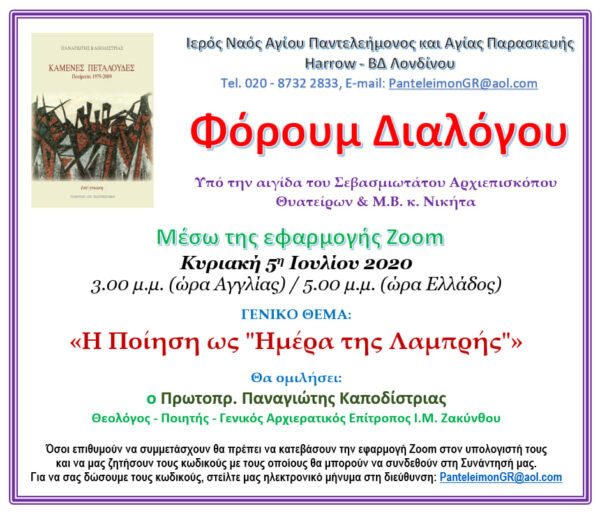 Φόρουμ Διαλόγου οργανώνει η Ιερά Αρχιεπισκοπή Θυατείρων και Μεγάλης Βρεταννίας μέσω της εφαρμογής ΖΟΟΜ την Κυριακή 5 Ιουλίου στο οποίο θα μιλήσει ο Πρωτοπρ. Παναγιώτης Καποδίστριας ο οποίος είναι Γενικός Αρχιερατικός Επίτροπος της Ιεράς Μητροπόλεως Ζακύνθου και γενικό θέμα του Διαλόγου θα είναι “Η Ποίηση ως Ημέρα της Λαμπρής”.