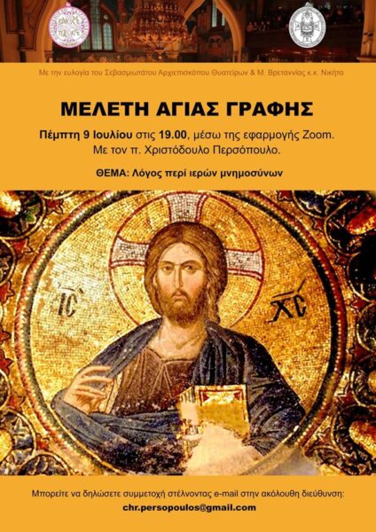 Με την ευλογία του Σεβασμιωτάτου Αρχιεπισκόπου Θυατείρων και Μεγάλης Βρετανίας κ.κ. Νικήτα, κατά την Πέμπτη 9 Ιουλίου στις 19.00, θα πραγματοποιηθεί ΜΕΛΕΤΗ ΤΗΣ ΑΓΙΑΣ ΓΡΑΦΗΣ μέσω εφαρμογής Zoom, με τον π. Χριστόδουλο Περσόπουλο.