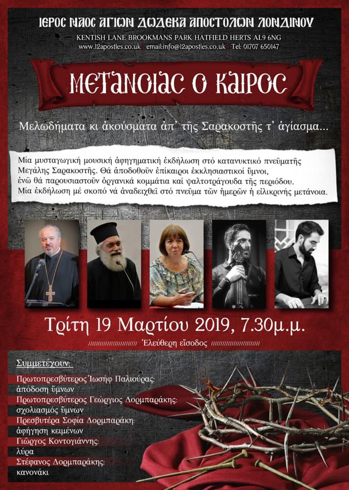 “Μελωδήματα και ακούσματα από της Σαρακοστής το αγίασμα” είναι το θέμα της μουσικής αφηγηματικής εκδήλωσης που διοργανώνεται από τον Ιερό ναό των Αγίων Δώδεκα Αποστόλων του Λονδίνου.