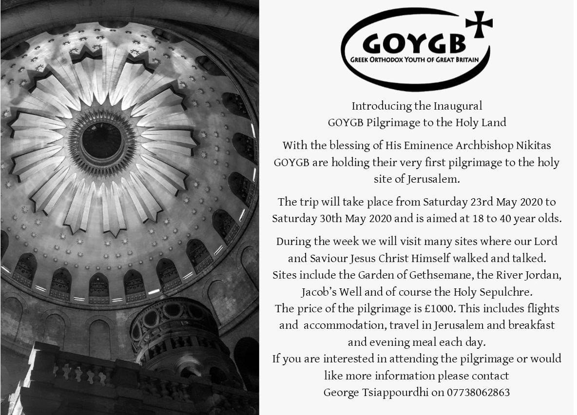 24/09/2019 24/09/2019 Προσκυνηματική εκδρομή στα Ιεροσόλυμα διοργανώνει η Αρχιεπισκοπή Θυατείρων και Μεγάλης Βρετανίας, με τις ευλογίες του Αρχιεπισκόπου κ. Νικήτα. Όπως αναφέρει η σχετική ανακοίνωση το ταξίδι θα πραγματοποιηθεί τον Μάιο του 2020 και αφορά σε ηλικίες από 18 έως 40 ετών. Η αποστολή θα επισκεφθεί τους Αγίους Τόπους κι όλα τα σημαντικά προσκυνήματα της περιοχής