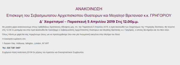Την Παρασκευή, 5 Απριλίου 2019, στις 12 το μεσημέρι, ο Σεβασμιώτατος Αρχιεπίσκοπος Θυατείρων και Μεγάλης Βρεταννίας, κ.κ. Γρηγόριος, θα προεξάρχει της Ακολουθίας Δ’ Χαιρετισμών στον Ιερό Ναό Αγίου Αντωνίου του Μεγάλου και Αγίου Ιωάννου του Βαπτιστού (1 Sussex Way, Holloway, Islington, London, N7 6RT) στην πόλη του Λονδίνου.