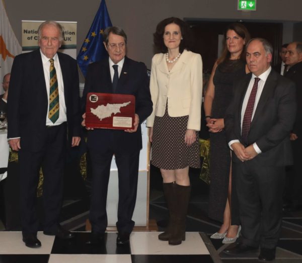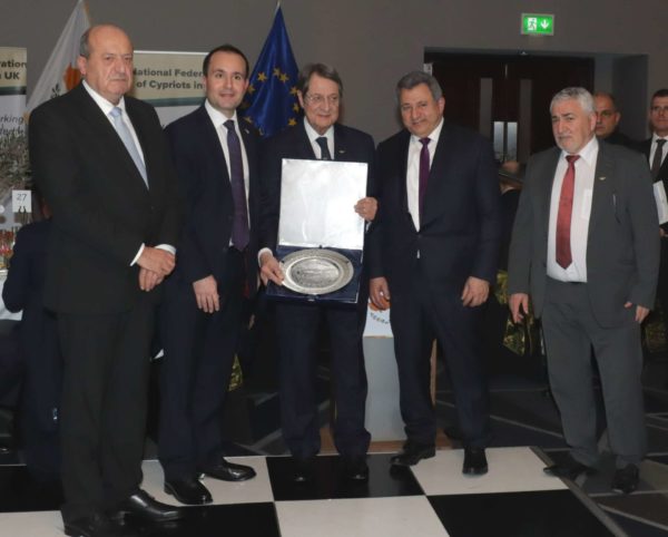 Στον Πρόεδρο της Κυπριακής Δημοκρατίας κ. Νίκο Αναστασιάδη απονεμήθηκε αναμνηστική πλακέτα από τον Πρόεδρο της Ομοσπονδίας κ. Χρήστο Καραολή και τους Αντιπροέδρους κ. Ανδρέα Παπαευριπίδη, κ. Μιχαήλ Έλληνα και κ. Μπάμπο Χαραλάμπους, για την αφοσίωση και την στήριξη του αγώνα του κυπριακού λαού, καθώς και για τις άοκνες προσπάθειές του για δικαιοσύνη και μια βιώσιμη λύση του Κυπριακού.