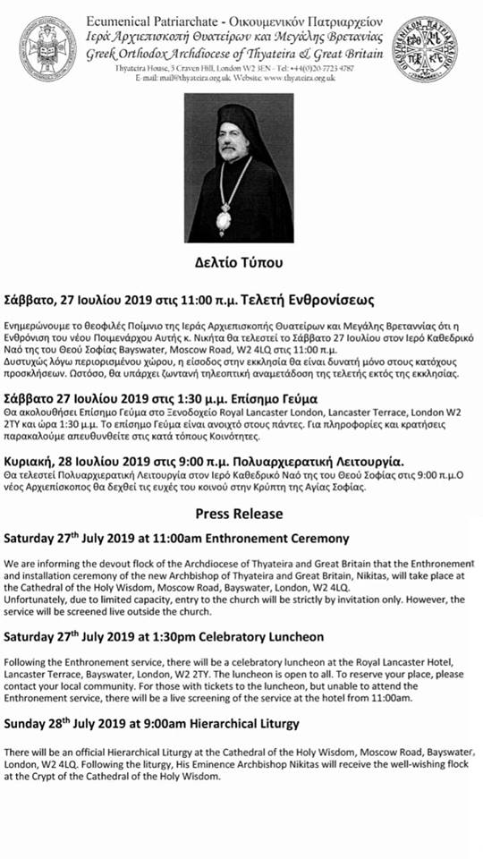 Η ενθρόνιση του νέου Αρχιεπισκόπου Θυατείρων και Μεγάλης Βρετανίας κ. Νικήτα, θα πραγματοποιηθεί το Σάββατο 27 Ιουλίου 2019, ανήμερα του Αγίου Παντελεήμονος, στον Ιερό Καθεδρικό Ναό της του Θεού Σοφίας στο Bayswater του Λονδίνου.