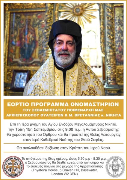 Επί τη ιερά μνήμη του Αγίου Ενδόξου Μεγαλομάρτυρος Νικήτα, την Τρίτη 15 Σεπτεμβρίου στις 9.00 π.μ., ο Σεβασμιώτατος Αρχιεπίσκοπος Θυατείρων και Μεγάλης Βρετανίας κ. Νικήτας, ο οποίος άγει τα ονομαστήριά του, θα προστεί της Θείας Λειτουργίας στον Ιερό Καθεδρικό Ναό της του Θεού Σοφίας στο Λονδίνο. Θα ακολουθήσει δεξίωση στην Κρύπτη του Ιερού Ναού.