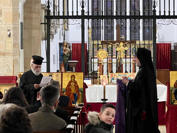 Ο Σεβασμιώτατος προεξήρχε της Ακολουθίας του Νυμφίου και στη συνέχεια τον καλωσόρισε ο Οικονόμος π. Ανδρέας Amirhom, ιερατικώς Προϊστάμενος της ενορίας, ο οποίος ευχαρίστησε τον Αρχιεπίσκοπο εκ μέρους της κοινότητος για την επίσκεψή του.