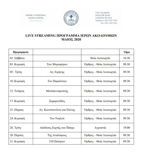 01/05/2020 01/05/2020 Επισυνάπτεται το Πρόγραμμα (Live Streaming) Ιερών Ακολουθιών απο τον Καθεδρικό Ναό της του Θεού Σοφίας Λονδίνου. Παρακολουθήστε τις Ιερές Λειτουργίες ζωντανά από τον παρακάτω σύνδεσμο: Ζωντανή Μετάδοση