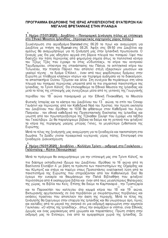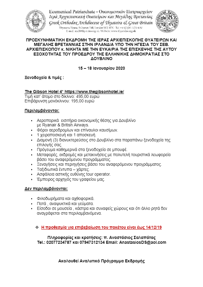 Η Ιερά Αρχιεπισκοπή θυατείρων και Μεγάλης Βρετανίας διοργανώνει υπό την ηγεσία του Σεβασμιωτάτου Αρχιεπισκοπου κ. Νικήτα προσκυνηματική εκδρομή στην Ιρλανδία επί τη ευκαιρία της επίσκεψης του Εξοχωτάτου Προέδρου της Ελληνικής Δημοκρατίας κ. Προκόπη Παυλόπουλου στο Δουβλίνο μεταξύ 15 και 18 Ιανουαρίου 2020.
