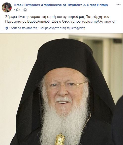 Πολλά Έτη, εύχεται η Ιερά Αρχιεπισκοπή Θυατείρων και Μεγάλης Βρετανίας προς τον Παναγιώτατο Οικουμενικό Πατριάρχη κ.κ. Βαρθολομαίο, σε επίκαιρη ανάρτησή της. “Σήμερα, είναι η ονομαστική εορτή του αγαπητού μας Πατριάρχη, του Παναγιωτάτου Βαρθολομαίου. Είθε ο Θεός να του χαρίσει πολλά χρόνια!”.