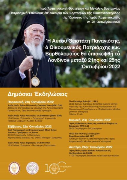 Το πρόγραμμα της επίσκεψης του Οικουμενικού Πατριάρχη στην Ιερά Αρχιεπισκοπή Θυατείρων και Μεγάλης Βρετανίας: