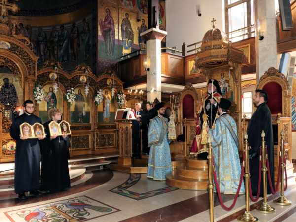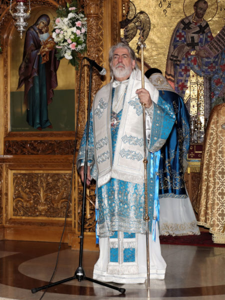 Στο τέλος της Θείας Λειτουργίας, ο Θεοφιλέστατος Επίσκοπος Κλαυδιουπόλεως κ. Ιάκωβος καλωσόρισε θερμά τον Αρχιεπίσκοπο και εξέφρασε την ευγνωμοσύνη του προς τον Άρχοντα κ. Πέτρο Δημητρίου, για τη δωρεά της περίτεχνης ψηφιδωτής εικόνας της Κοιμήσεως της Θεοτόκου.