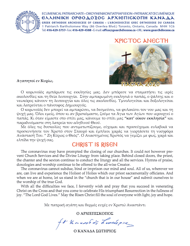 Αναλυτικά, η Πασχαλινή Εγκύκλιος του Σεβ. Αρχειεπισκόπου Καναδά κ. Σωτηρίου αναφέρει: