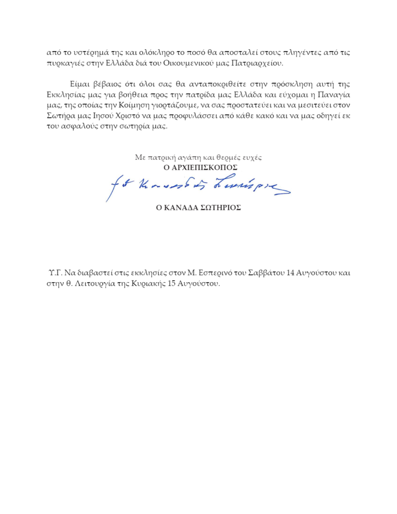Το ποσό το οποίο θα συγκεντρωθεί, παρακαλώ να αποσταλεί εξ ολοκλήρου στην Ιερά μας Αρχιεπισκοπή. Η Ι. Αρχιεπισκοπή μας θα προσθέσει κι αυτή ένα ποσό από το υστέρημά της και ολόκληρο το ποσό θα αποσταλεί στους πληγέντες από τις πυρκαγιές στην Ελλάδα διά του Οικουμενικού μας Πατριαρχείου.