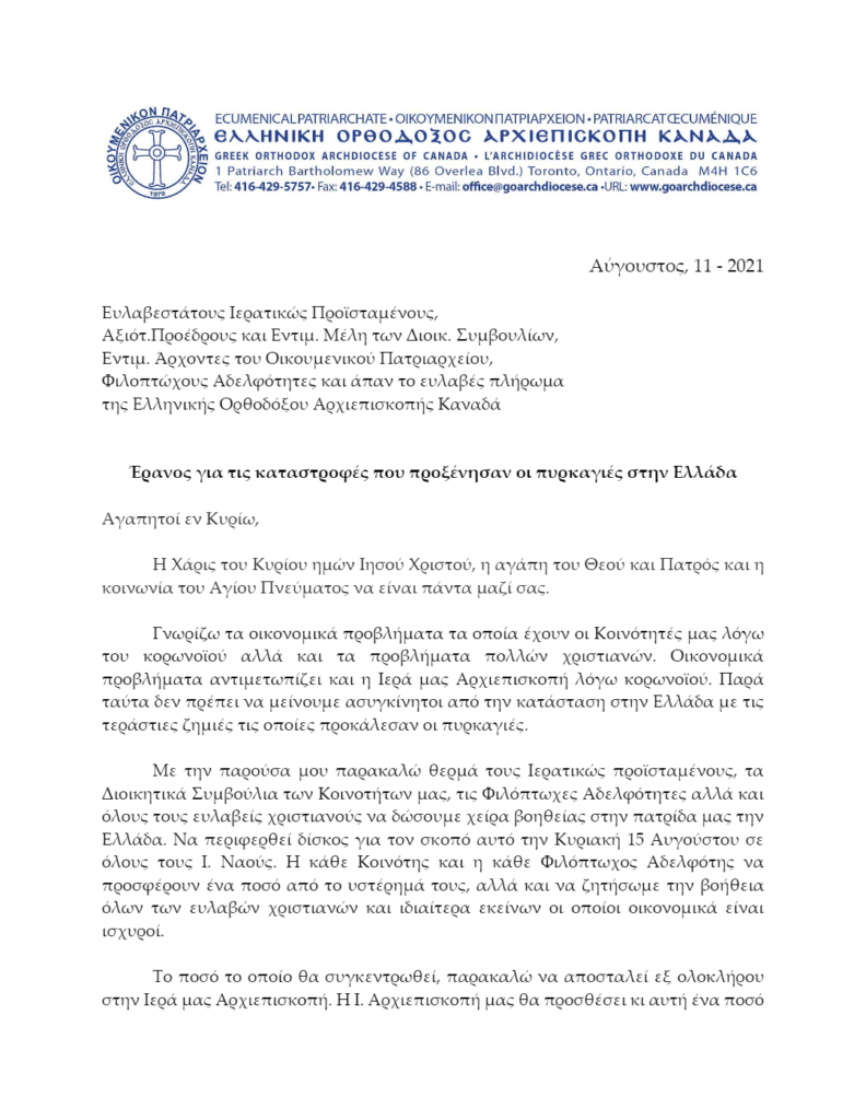 Έρανο για τους πληγέντες από τις καταστροφικές πυρκαγιές στην Ελλάδα πραγματοποιεί η Ιερά Αρχιεπισκοπή Καναδά, όπως ανακοίνωσε μέσω σχετικής Εγκυκλίου που εξέδωσε ο Σεβ. Αρχιεπίσκοπος Καναδά κ. Σωτήριος.