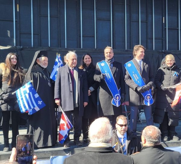 Στην εξέδρα της παρέλασης στο Μόντρεαλ συζυτούν. Από αριστερά: Υπουργός Εσωτερικών της Ελλάδας Νίκη Κεραμέως, Αρχιεπ. Σωτήριος, πρωθυπουργός Κυριάκος Μητσοτάκης και πρωθυπουργός Ιουστίνος Τρουντώ.