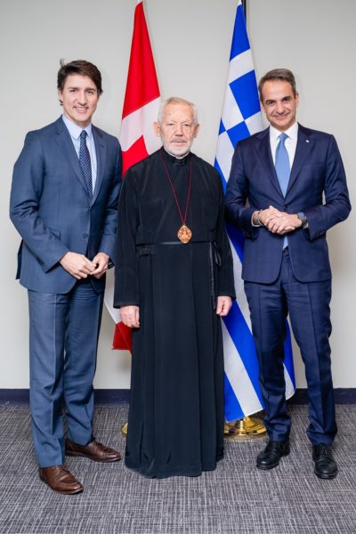 O πρωθυπουργός Καναδά Ιουστίνος Τρουντώ και ο πρωθυπουργός της Ελλάδας Κυριάκος Μητσοτάκης με τον Αρχιεπίσκοπο Σωτήριο στο Τορόντο.