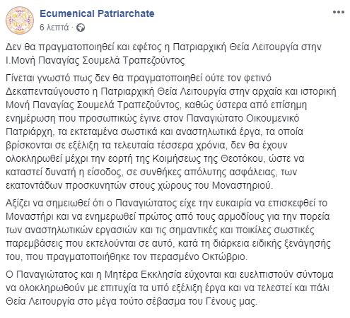 Γίνεται γνωστό πως δεν θα πραγματοποιηθεί ούτε τον φετινό Δεκαπενταύγουστο η Πατριαρχική Θεία Λειτουργία στην αρχαία και ιστορική Μονή Παναγίας Σουμελά Τραπεζούντος, καθώς ύστερα από επίσημη ενημέρωση που προσωπικώς έγινε στον Παναγιώτατο Οικουμενικό Πατριάρχη, τα εκτεταμένα σωστικά και αναστηλωτικά έργα, τα οποία βρίσκονται σε εξέλιξη τα τελευταία τέσσερα χρόνια, δεν θα έχουν ολοκληρωθεί μέχρι την εορτή της Κοιμήσεως της Θεοτόκου, ώστε να καταστεί δυνατή η είσοδος, σε συνθήκες απόλυτης ασφάλειας, των εκατοντάδων προσκυνητών στους χώρους του Μοναστηριού.