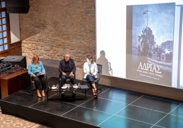 Για το βιβλίο «ΑΔΡΙΑΣ» μίλησε η δημοσιογράφος και συγγραφέας του Μαργαρίτα Πουρνάρα. Αναφέρθηκε στην τεράστια περιπέτεια ενός ολοκαίνουριου αντιτορπιλικού που παραχωρήθηκε στον ελληνικό στόλο το 1942 από τους Βρετανούς. Κατά την επιχείρηση της Δωδεκανήσου, το φθινόπωρο του 1943, ο «ΑΔΡΙΑΣ» έπεσε σε γερμανικό ναρκοπέδιο έξω από την Κάλυμνο. Υπέστη τρομακτικές ζημιές, χάνοντας την πλώρη του, είχε νεκρούς και τραυματίες αλλά ως εκ του θαύματος δεν πειράχτηκε το λεβητοστάσιό του. Το παραπλέον βρετανικό αντιτορπιλικό HURWORTH αποπειράθηκε να βοηθήσει τους Έλληνες αλλά έπεσε και αυτό σε νάρκη και βυθίστηκε.