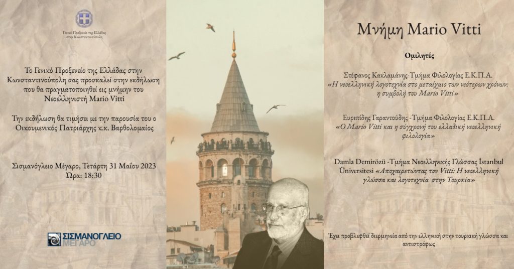 Το Γενικό Προξενείο της Ελλάδας στην Κωνσταντινούπολη διοργανώνει εκδήλωση που θα πραγματοποιηθεί στη μνήμη του Mario Vitti στο Σισμανόγλειο Μέγαρο απόψε, Τετάρτη 31 Μαΐου 2023, στις 18:30 τοπική ώρα.