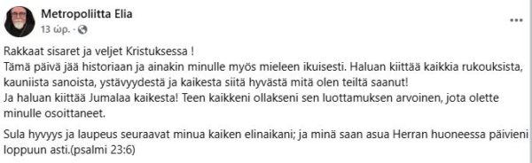 Ως μια ιστορική και ξεχωριστή ημέρα για την ζωή του χαρακτήρισε ο νέος Αρχιεπίσκοπος Ελσινκίου και πάσης Φινλανδίας κ. Ηλίας την εκλογή του, από την κληρικολαϊκή συνέλευση, στη θέση του Αρχιεπισκόπου της Αυτόνομης Εκκλησίας της Φινλανδίας