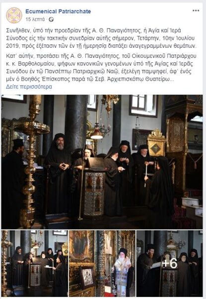 Συνῆλθεν, ὑπό τήν προεδρίαν τῆς Α. Θ. Παναγιότητος, ἡ Ἁγία καί Ἱερά Σύνοδος εἰς τήν τακτικήν συνεδρίαν αὐτῆς σήμερον, Τετάρτην, 10ην Ἰουλίου2019, πρός ἐξέτασιν τῶν ἐν τῇ ἡμερησίᾳ διατάξει ἀναγεγραμμένων θεμάτων.