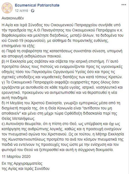 11/03/2020 11/03/2020 Η Αγία και Ιερά Σύνοδος του Οικουμενικού Πατριαρχείου συνήλθε υπό τήν προεδρεία της Α.Θ.Παναγιότητος του Οικουμενικού Πατριάρχου κ.κ. Βαρθολομαίου και μελέτησε διεξοδικώς, μεταξύ άλλων, τα δεδομένα του ιού Covid-19 (κορωνοϊού), με αίσθημα δε ποιμαντικής ευθύνης, επισημαίνει τα εξής: α) Παρά τη σοβαρότητα της καταστάσεως συνιστάται σύνεση, υπομονή και αποφυγή εκδηλώσεων πανικού. β) Η Εκκλησία μας...