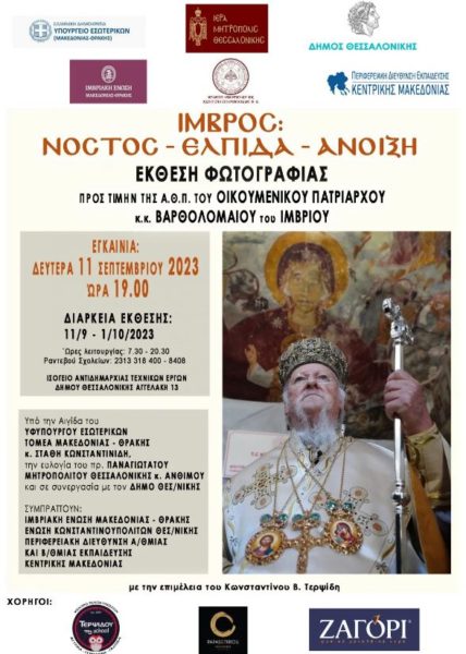 Τη Δευτέρα, 11 Σεπτεμβρίου 2023 και ώρα 19:00, θα πραγματοποιηθούν τα εγκαίνια έκθεσης φωτογραφίας, προς τιμήν της Α.Θ.Π. του Οικουμενικού Πατριάρχου κ.κ. Βαρθολομαίου του Ιμβρίου, με τίτλο «ΙΜΒΡΟΣ: ΝΟΣΤΟΣ – ΕΛΠΙΔΑ – ΑΝΟΙΞΗ».